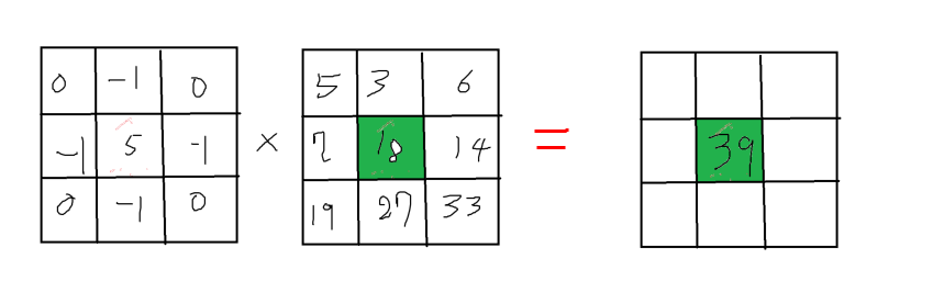 두번째 3x3에 있는 값들을 왼쪽의 3x3 행렬을 가중치로 삼아서 계산하면 (18은 곱에서 제외 -> 18 이 있는 칸을 구할거니까 계산하면 안됨) --> 그렇게 계산을 마치면 39라는 답이 나오고, 이 값을 18과 치환해주는 것이다.