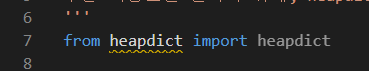 heapdict라이브러리를 사용하기 위해 from절에 적어주었는데 노란 밑줄이 있는 것을 볼 수 있다.