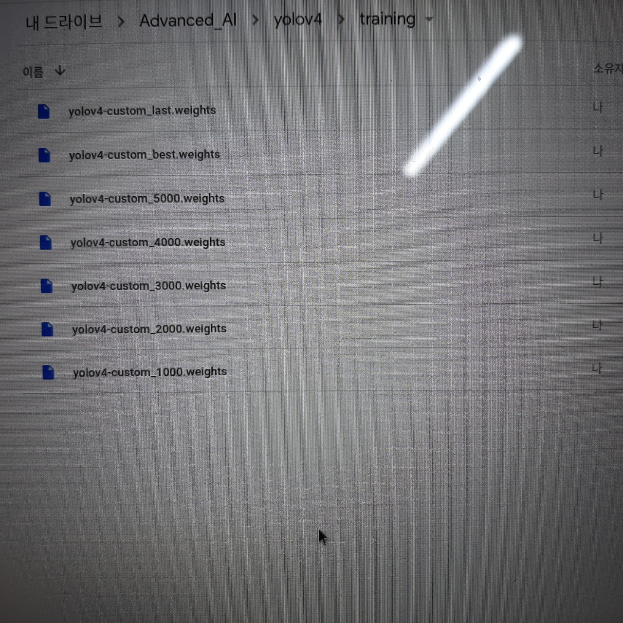 그래도 사실 속마음은 인식률이 어떻든 작동이라도 해서 다행이다. colab에 있던 코드 중 한 두개가 말썽을 부려서 꾸역꾸역 고치긴 했는데 (yolov4-custom.cfg파일에서도 [YOLO] 태그에서 classes를 3으로 바꿨는데 그 위에 filter 숫자를 안바꿔서 Wrong Annotation에러가 발생하기도 했다. 이외에 자잘한 문제가 꽤 있었다. ) 현재로서는 잘 돌아간다.