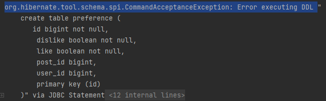 프로젝트를 수정하는 도중 새로운 jpa 엔티티를 추가해서 진행하고 있었는데 ddl-auto: create으로 테이블을 생성해보니 org.hibernate.tool.schema.spi.CommandAcceptanceException: Error executing DDL 이라는 에러가 발생했다. 분명 h2 디비도 잘 돌아가고 있었는데 왜 ddl 구문에서 에러가 발생했을까?