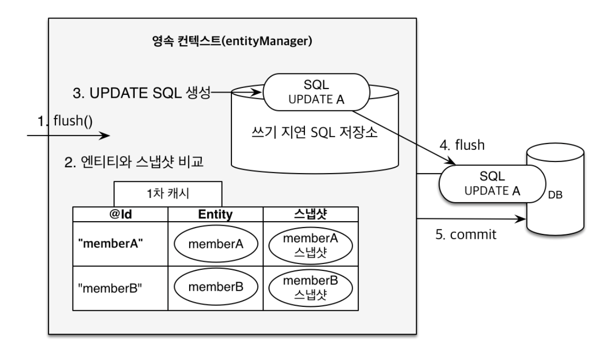 1) 변경 감지가 동작해서 스냅샷과 비교해서 수정된 엔티티를 찾는다.