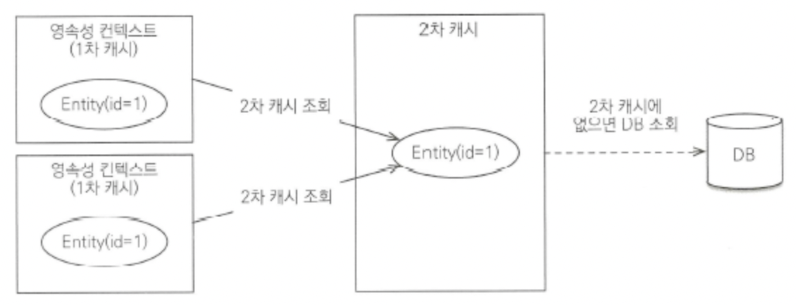 엔티티 매니저를 통해서 데이터를 조회할 때 우선적으로 2차 캐시에서 찾고, 없으면 데이터베이스에서 찾는다고 한다. 2차 캐시를 적절히 활용하면 데이터베이스 조회 횟수를 획기적으로 줄일 수 있다고 한다.