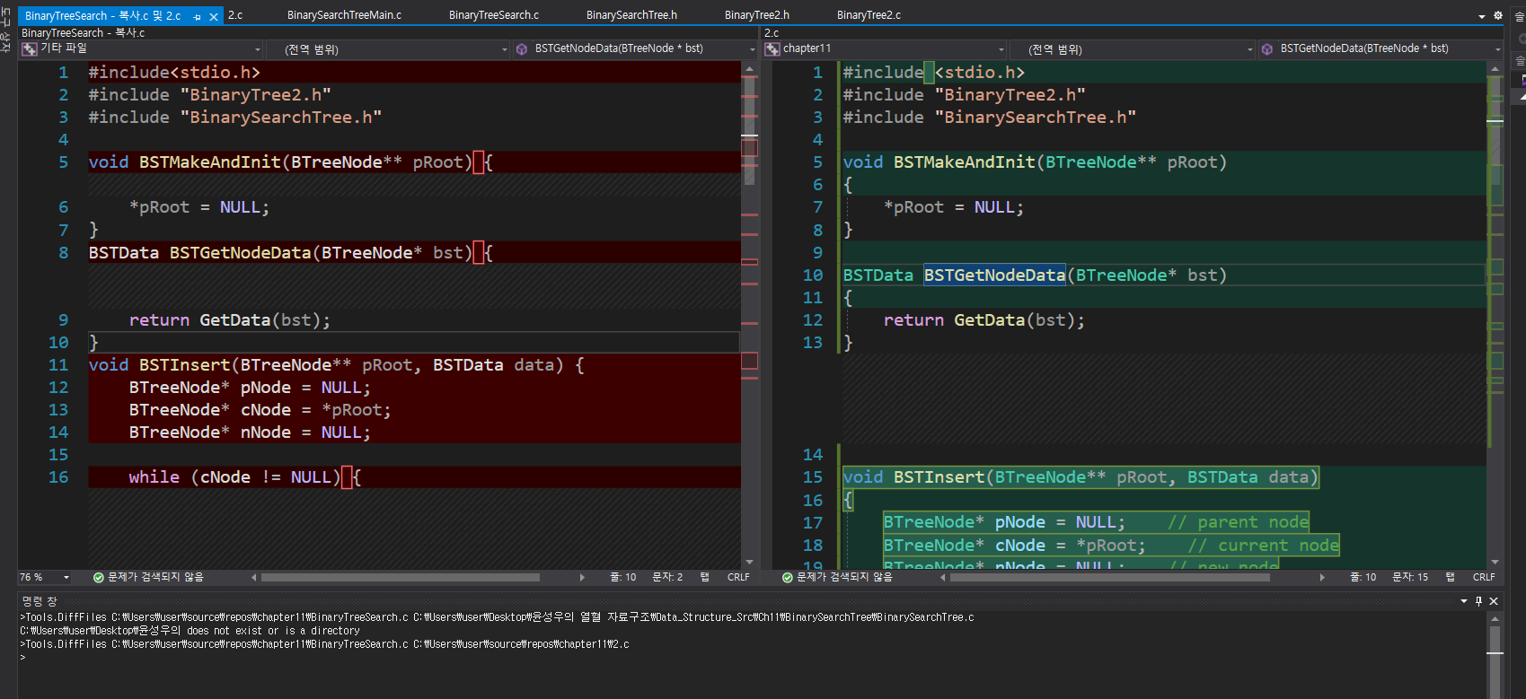 visual studio 에 코드 비교하기 기능이 있는 줄 몰랐는데, 있었다... 여지껏 vscode로 가져다가 비교하는 짓을 반복했었는데, 난 바보다... 검색해보니 있긴있는데, 좀 불편하게 지원해준다. vscode같은 경우는 그냥 파일하나 클릭해서 비교할 대상파일도 또 선택해서 클릭해주면 바로 지원해주는데 vs같은 경우는 내가 직접 타이핑해야 한다. 그럼에도 유용하다. ㅎㅎ 터미널창에 Tools.DiffFiles C:\Users\user\source\repos\chapter11\BinaryTreeSearch.c C:\Users\user\source\repos\chapter11\2.c 이런식으로 써주면 된다. Tools.DiffFiles 뒤에 경로 두개를 써준다. (초록색이 경로1, 빨간색이..