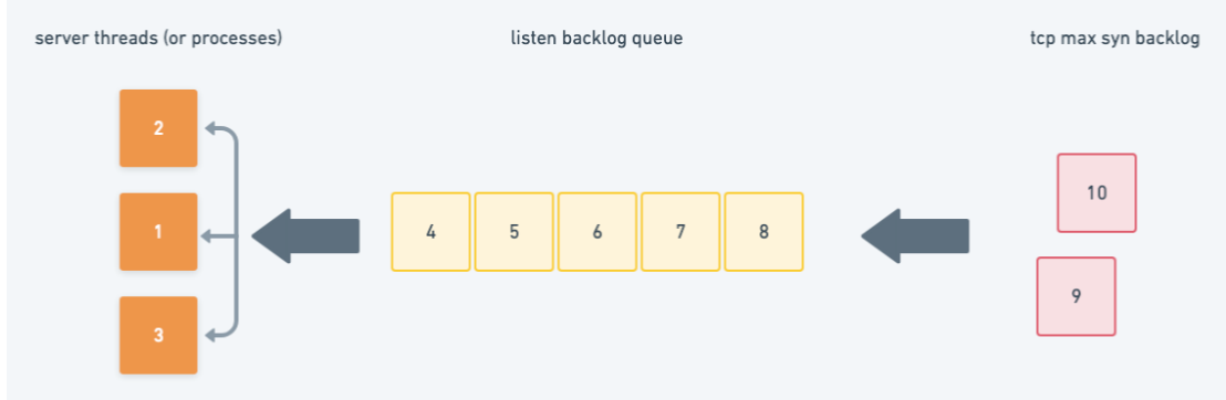 C++ 을 사용해서 소켓 프로그래밍을 하던 중 listen api 에서 두번째 인자로 넘겨주는 backlog 라는 파라미터에 대해 정확하게 알고 있지 못했다. 우선 리눅스 메뉴얼에 들어가서 listen api 의 backlog 파라미터의 설명을 보면 다음과 같이 적혀있다. 즉 간단하게 보자면 큐 사이즈를 지정한다는 내용이다. 그런데 어떤 큐 사이즈를 지정하는것일까? 이제 아래 그림을 보자. 왼쪽이 서버에서 동시에 응답할 수 있는 최대 갯수라고 가정한다면 (현재로썬 3개) backlog 값이 5라고 했을때 아래와 같은 상황이 연출되는 것이다. 가운데 있는 listen backlog queue의 사이즈가 5로 잡혀있는 것이다. 그러니 10개의 요청이 들어왔을때 1, 2, 3 은 서버쪽에서 처리하고 있고 아직..