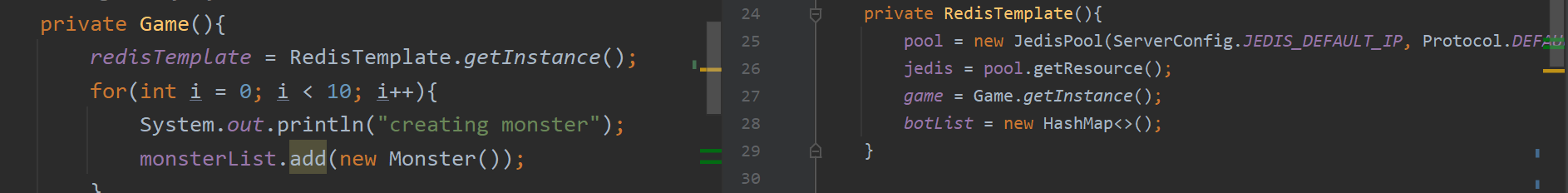 오늘 코드를 작성하던 중 신기한 현상을 만났다. 게임 서버를 구동했는데 정상 작동하지 않았다. 신기하게도 아무런 에러도 찍히지 않았다. 분명 어딘가 문제가 있을 것이라고 생각하고 살펴보았지만 짐작가는 곳은 없어서 빠르게 해결하기 위해 출력문으로 찍어보고 문제의 핵심을 찾았다. 아래 두 코드 부분을 보자. 두 코드는 각각 Game과 RedisTemplate의 생성자에 관한 코드이다. 왼쪽에 존재하는 Game에서는 RedisTemplate의 객체를 getInstance를 통해 받아오려 하고 있다. 오른쪽의 RedisTemplate 또한 Game의 객체를 getInstance를 통해 받아오려 하고 있다. 참고로 Game와 RedisTemplate 모두 싱글톤으로 작성되어있다. 그렇다면 이렇게 생성자 내에서 서..